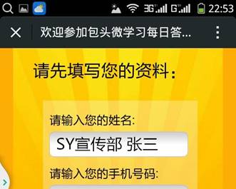 二、首次进入“金榜”“闯关答题”栏目时,需先注册个人信息,“姓名”一栏需填写“识别编码+单位名称(建议使用常用简称)+本人真实姓名”。万象城官网识别编码为KD。如:包头师范学院宣传部 张三,需在“请输入您的姓名”中填写“SY宣传部张三”。如: