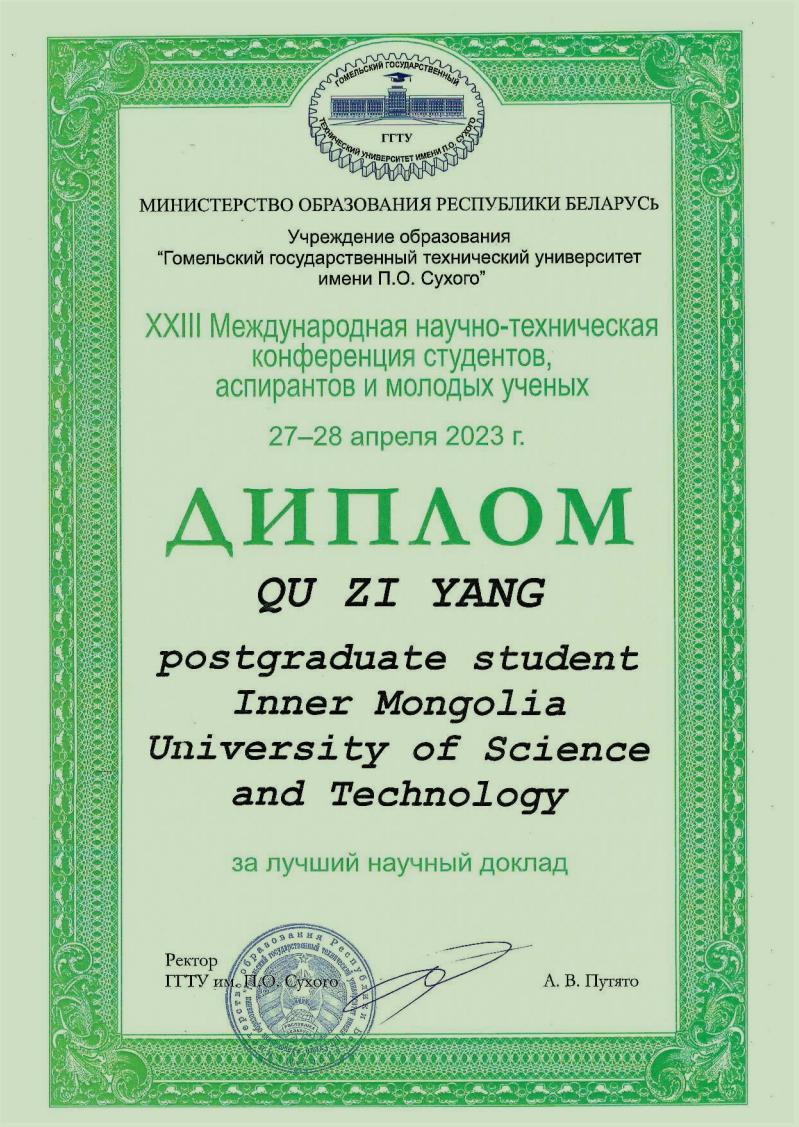 近日,应白俄罗斯戈梅利国立技术大学(The Sukhoi State Technical University of Gomel)第23届青年科学家、研究生、学生国际科技会议组委会邀请,万象城官网信息工程学院、机械工程学院及能源与环境学院的12名研究生以视频会议模式参会并作报告,其中机械工程学院研究生曲子洋获最佳科学报告奖。
