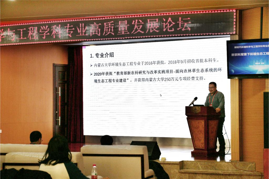 屈忠义在致辞中说,学校环境科学与工程学科立足内蒙古自治区“生态优先、绿色发展”战略和区域特点,紧密结合国家、自治区经济社会发展,坚持服务地方,聚焦自治区“五大任务”,瞄准社会需求和学科前沿发展方向,深入开展学科和专业内涵建设。希望各位专家学者以此次论坛为契机,建立学校间学科建设交流机制,共享学科专业建设宝贵经验,携手加快推进环境学科专业的发展步伐。