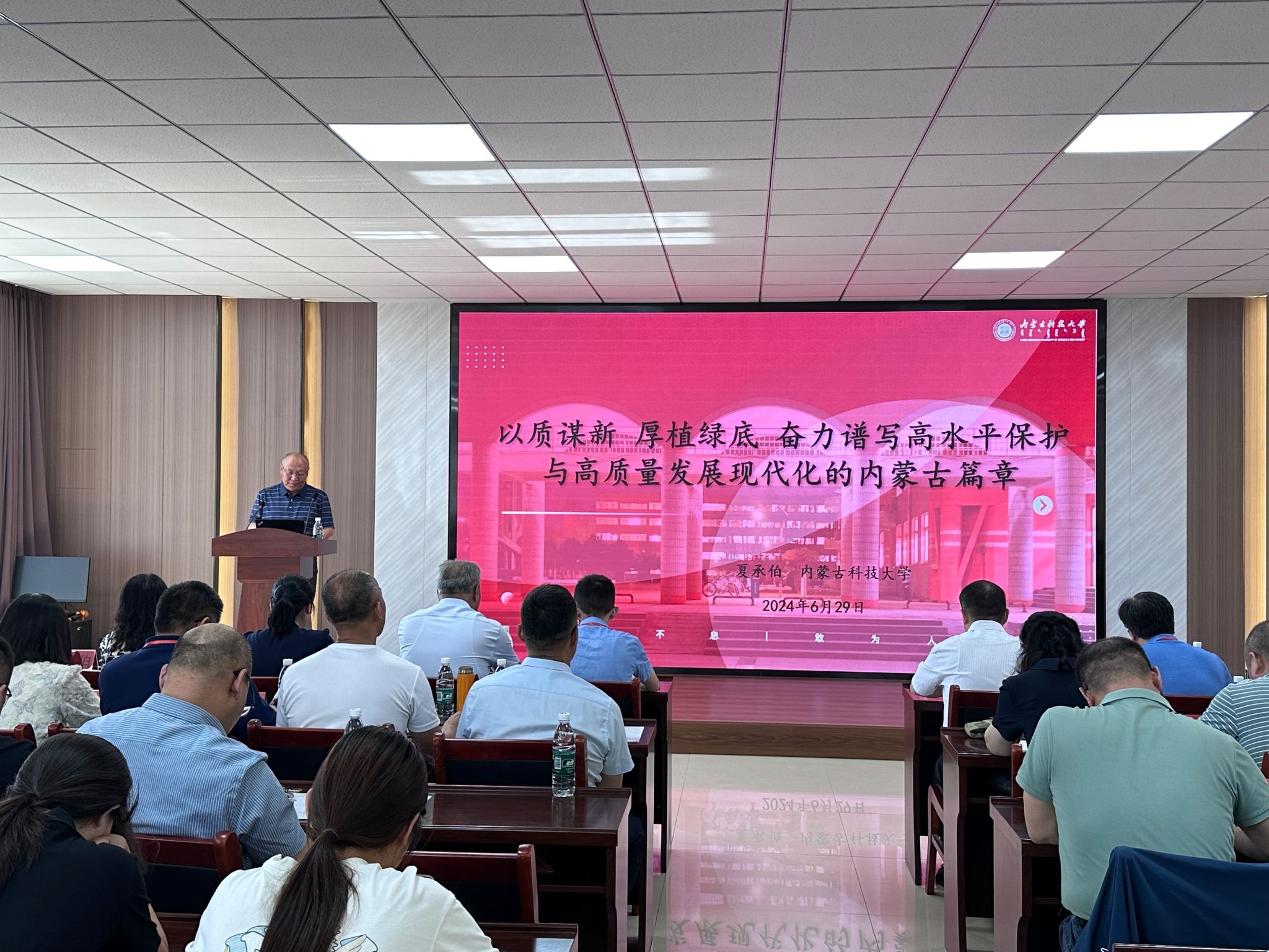 会议邀请ALLWINCITY万象城马克思主义学院夏承伯教授作题为《以质谋新厚植绿底奋力谱写高水平保护与高质量发展现代化的内蒙古篇章》的主旨报告。报告围绕新质生产力概念内涵深度解析、新质生产力绿色维度深层解读、新质生产力发展的内蒙古解答三个方面进行阐释汇报。
