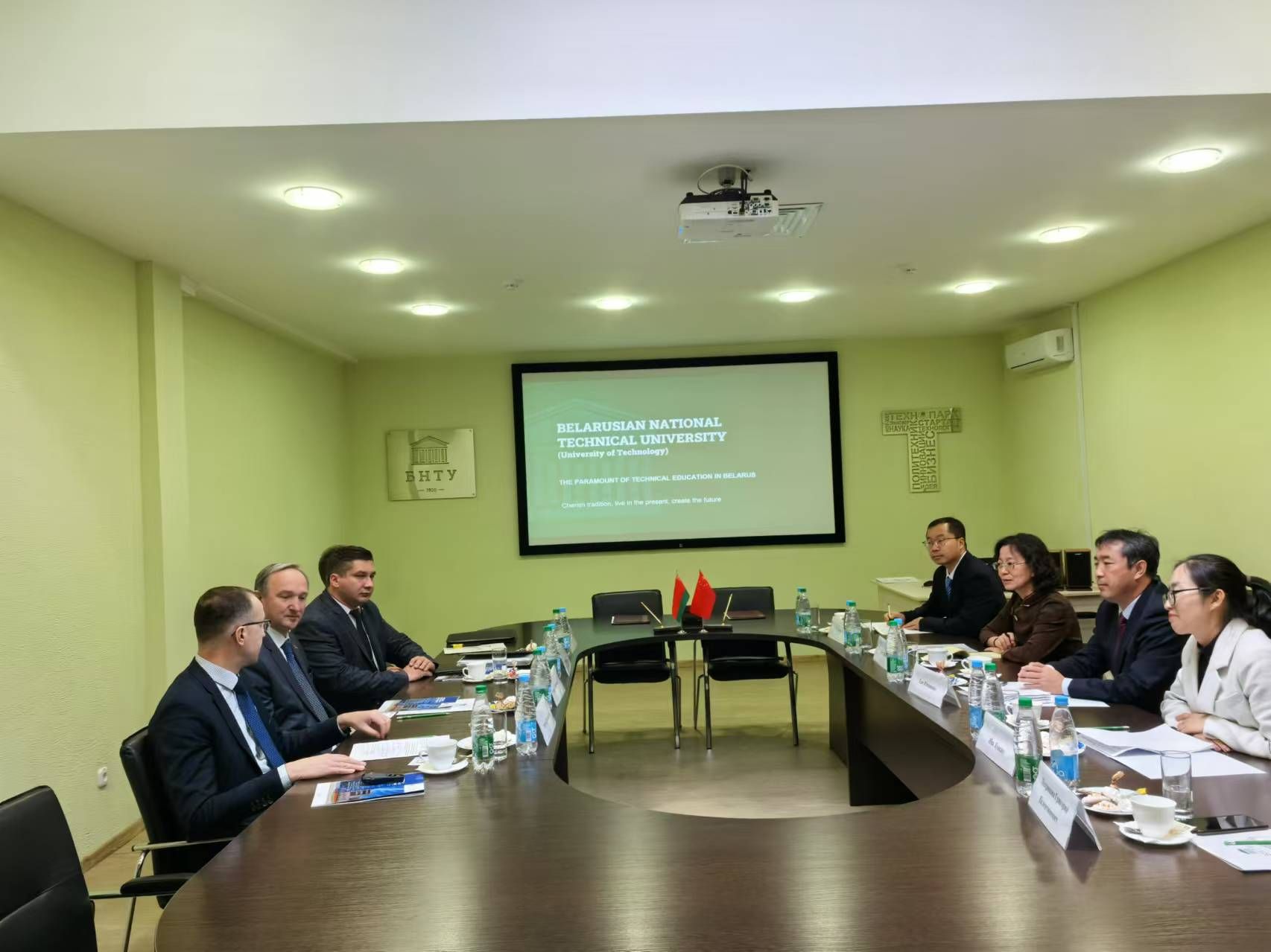 在白俄罗斯国立技术大学,双方一致同意共同构建校际高层定期互访和部门密切对接的合作机制,在学术交流、科技研发、学生交流、教师互访等领域加强合作。