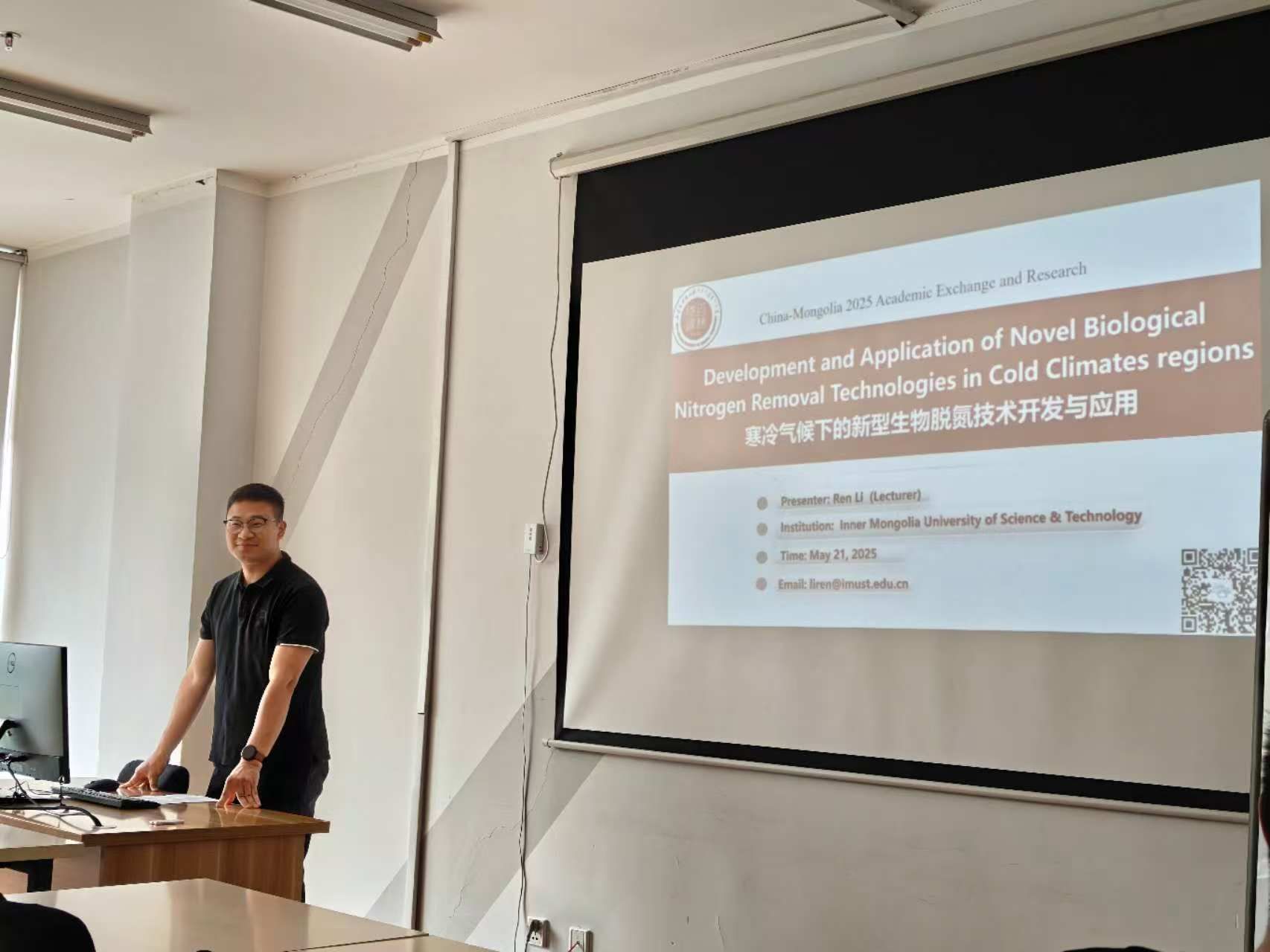 蒙古国立大学工程技术研究院院长Sonomdagva接待了团队人员,详细介绍了工程技术研究院环境科学与工程专业的建设历程与研究方向。李韧老师和硕士研究生张宝平分别向蒙古国立大学师生作题为《R&D and application of novel low-temperature nitrogen removal technologies》《Advances in wastewater treatment: low-temperature adaptation, carrier development, antibiotic response, reactors》的报告,系统展示了万象城官网黄河流域寒旱区水土环境研究中心的研究方向和进展。双方就中蒙污水处理技术的差异性和所面临的不同挑战进行深入交流。