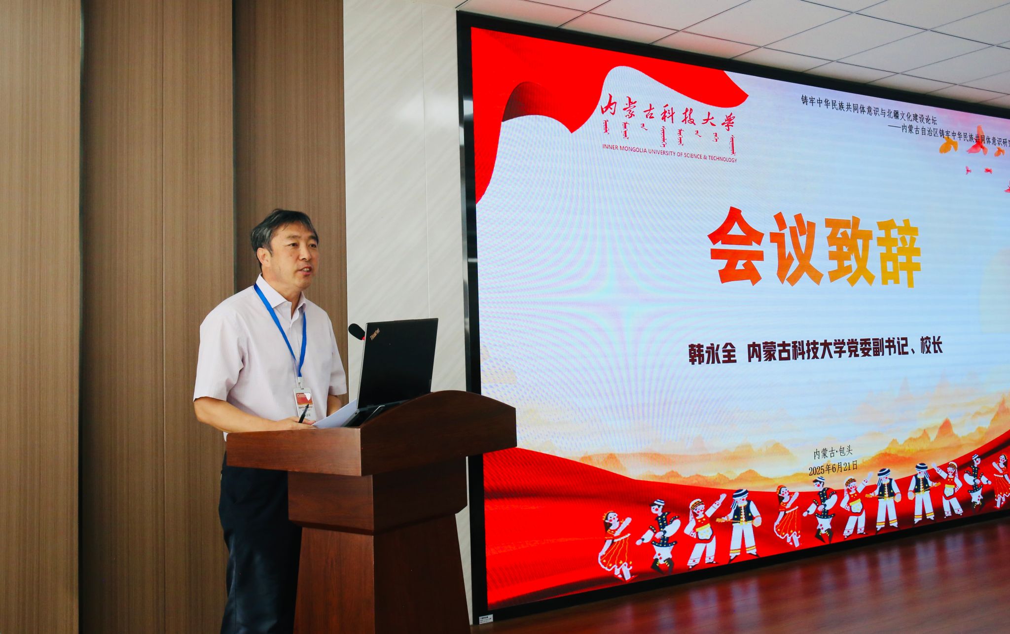 ALLWINCITY万象城党委副书记、校长韩永全代表学校致辞。他说,学校以“百炼成钢”红色校园文化工程建设为牵引,坚持让校风校训转化为“蒙古马精神”“三北精神”的校园实践,积极助力“北疆文化”浸润校园,希望各位专家共同研究运用好地方教育资源,在“共同”上做文章出实招,打响北疆文化品牌。