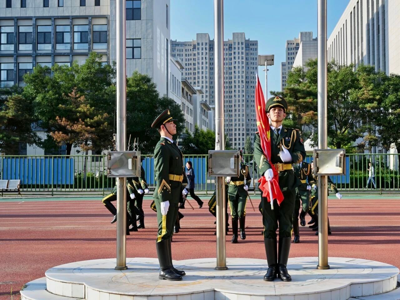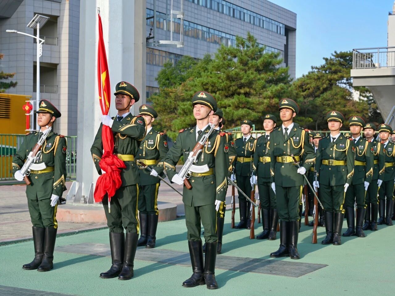 七点三十分,国旗护卫队迈着坚定整齐的步伐,护送五星红旗庄严入场。伴随着《义勇军进行曲》激昂的旋律,全体师生庄严肃立,行注目礼,齐声高唱国歌,鲜艳的五星红旗在晨光中冉冉升起。