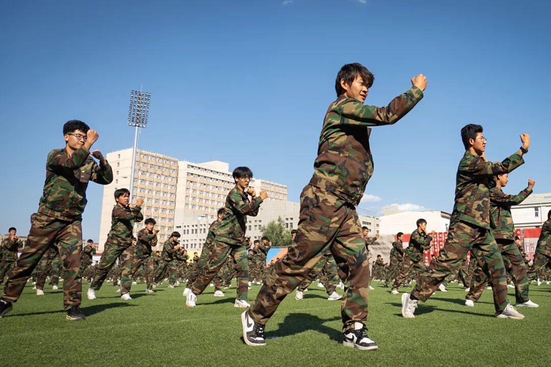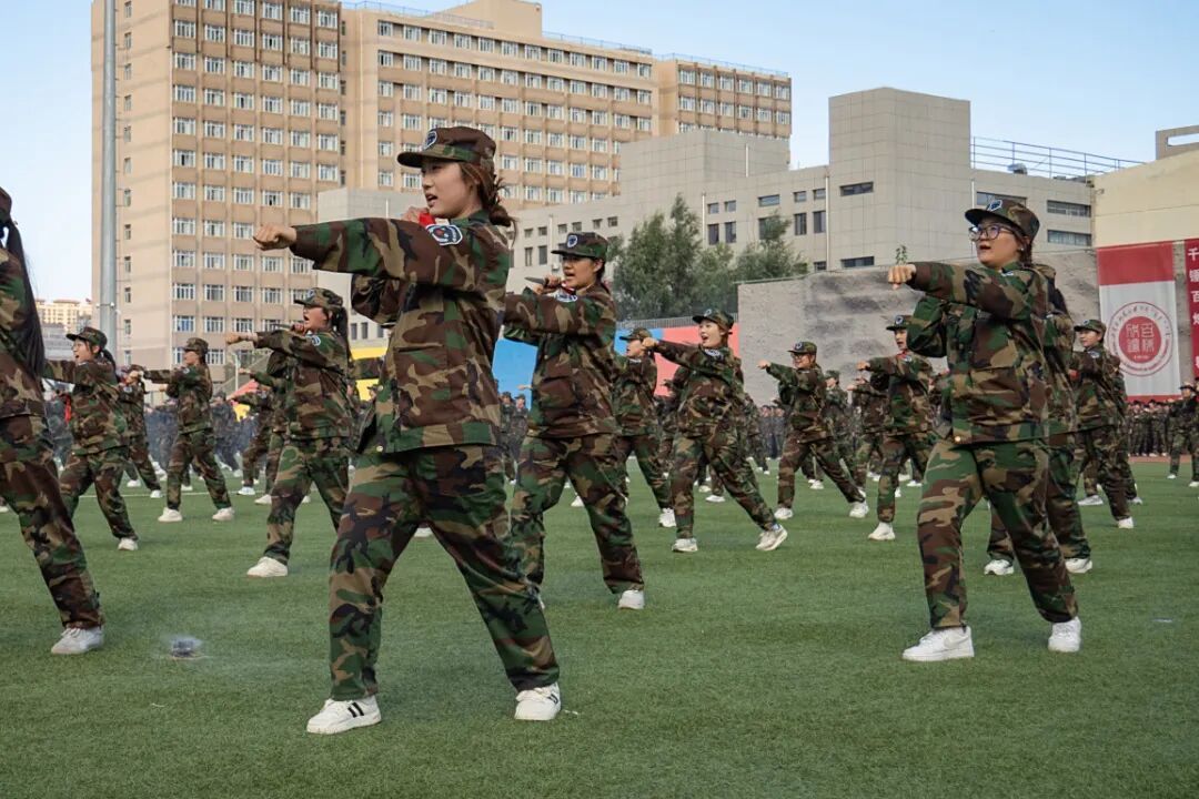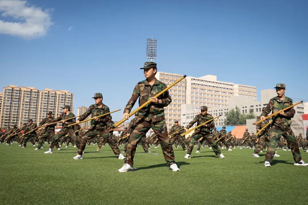 参训学生进行了拳术、刺杀操、匕首操等军事科目汇报,展现出科大学子积极向上、奋发拼搏的精神风貌。拳术方队以《男儿当自强》的旋律节奏与精神内涵为基调,将拳术动作、队列变换与音乐节点完美契合。刺杀操方队以刚猛姿态震撼亮相,不仅展示了动作与战术,更生动诠释了“自强不息敢为人先”的科大校风。匕首操方队整齐列队、精神抖擞,每一个动作都刚劲有力、精准到位,连贯的招式将匕首操的攻防要义展现得淋漓尽致。随后进行队列会操,伴随着雄壮的《分列式进行曲》,63个连队正步走过主席台,铿锵有力的步伐踏出钢铁意志,响彻云霄的口号喊出铮铮誓言。