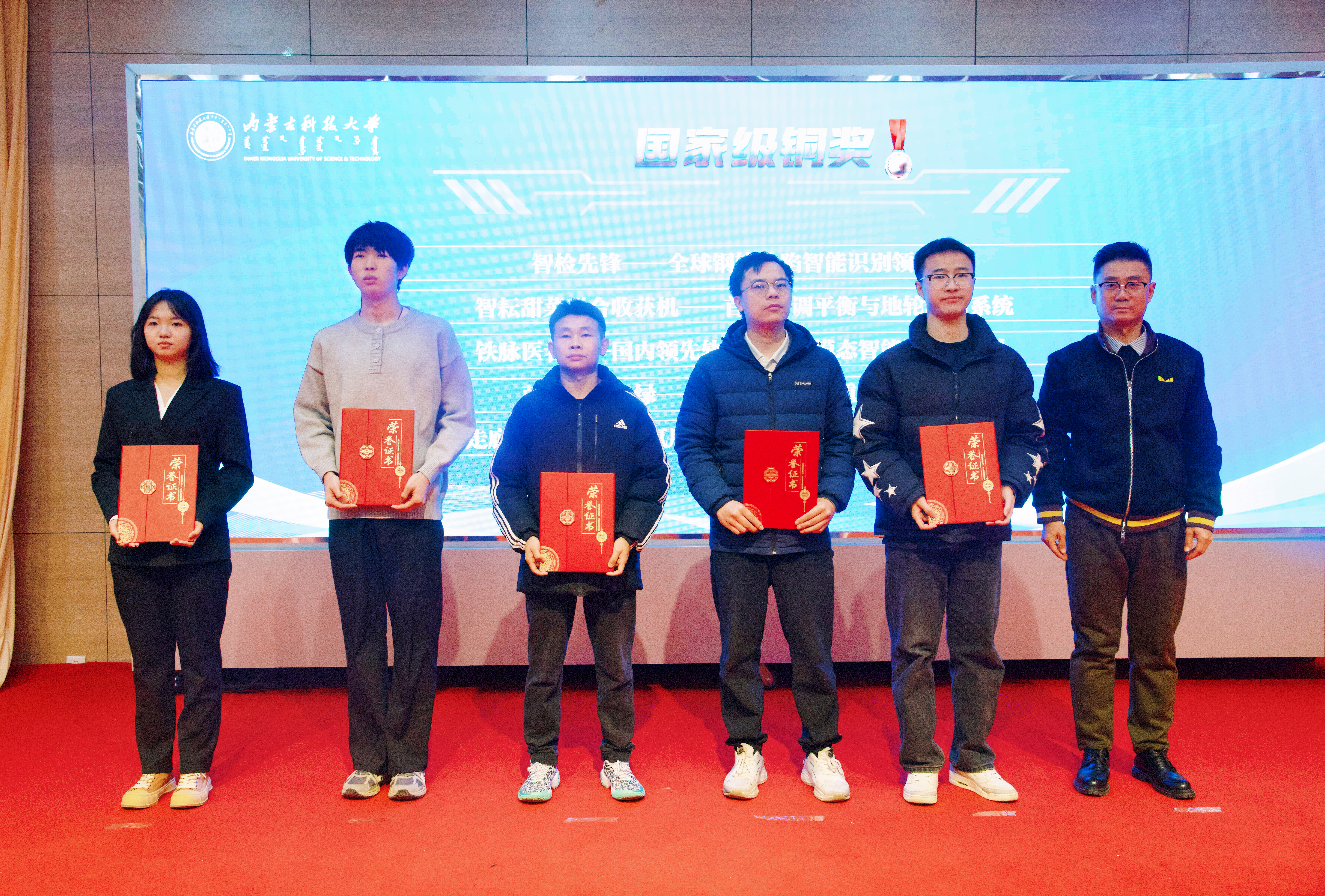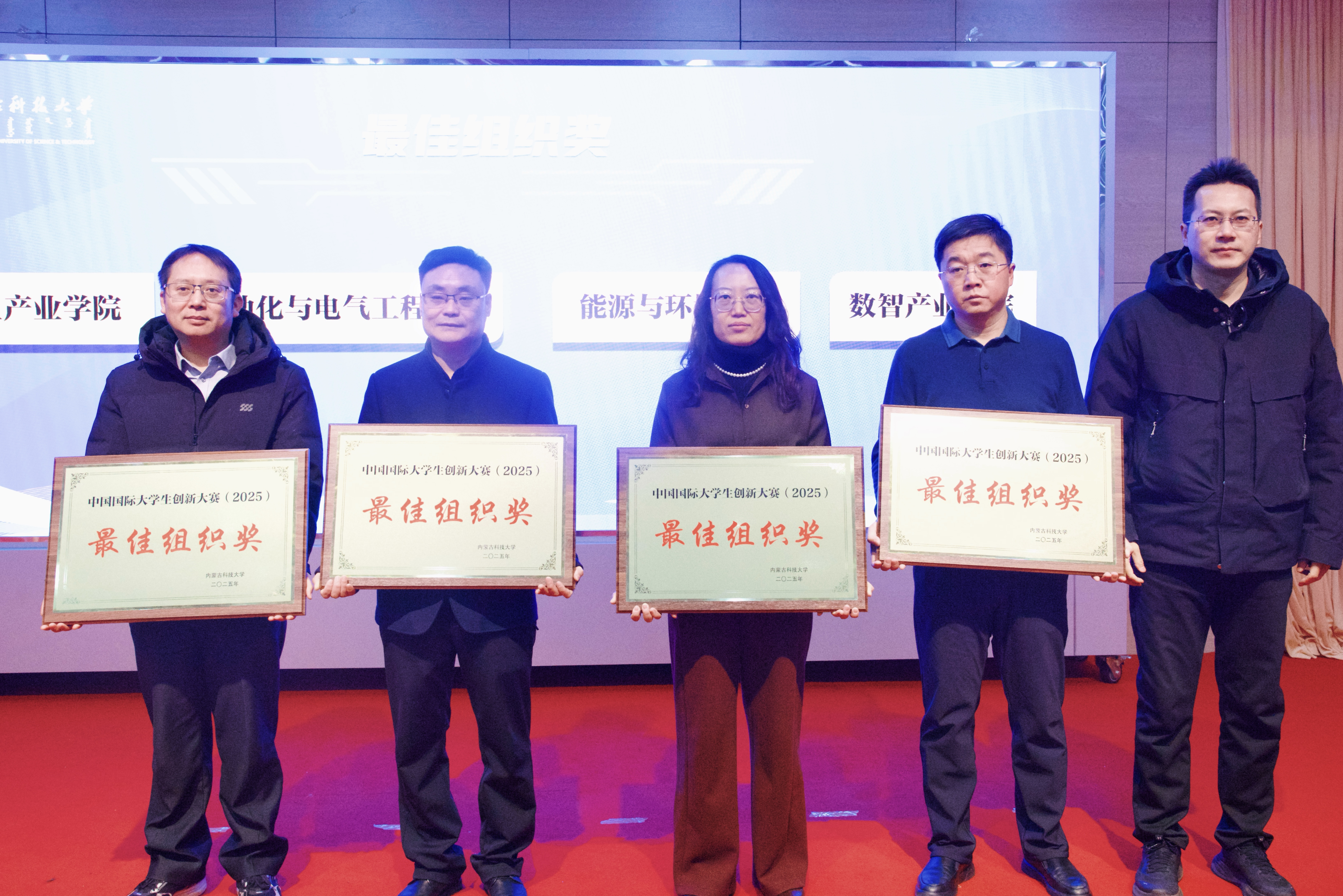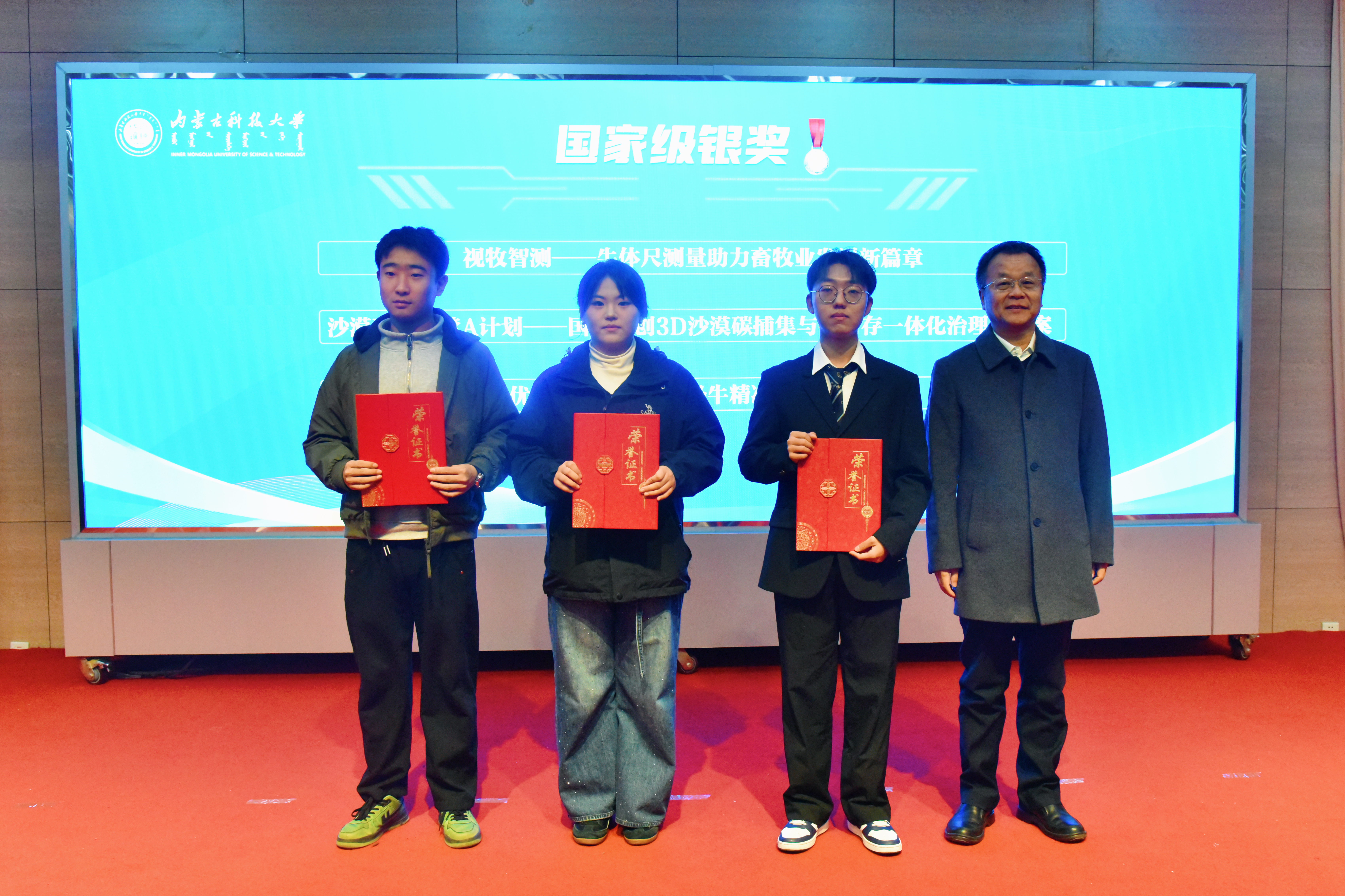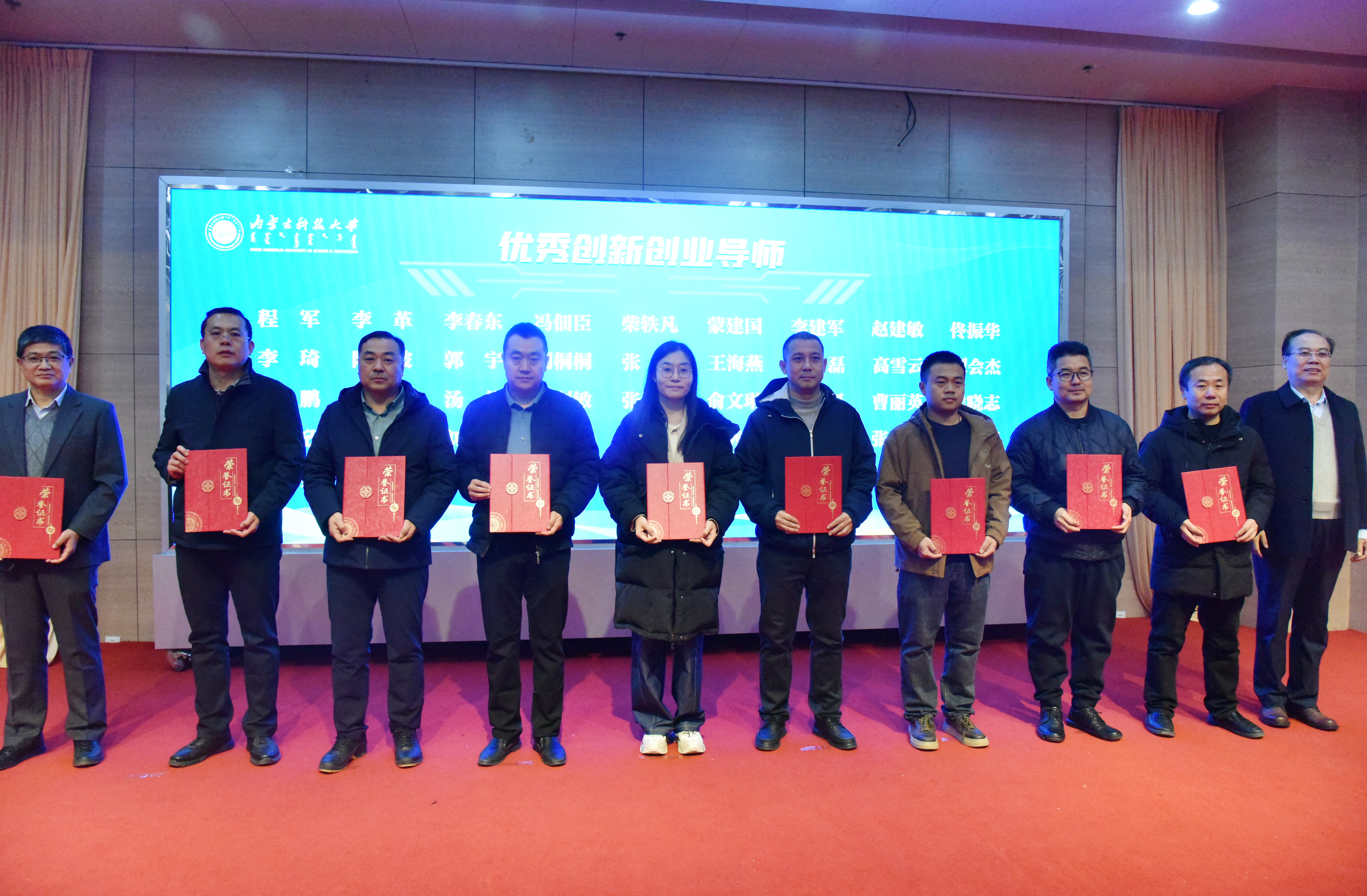 创新创业教育学院副院长陈星宣读获奖名单,大会对7个“优秀组织奖”单位、4个“最佳组织奖”单位、40名“自治区级优秀指导教师”及国家级获奖项目团队进行表彰。呼和、李卫平等领导为获奖代表颁奖。