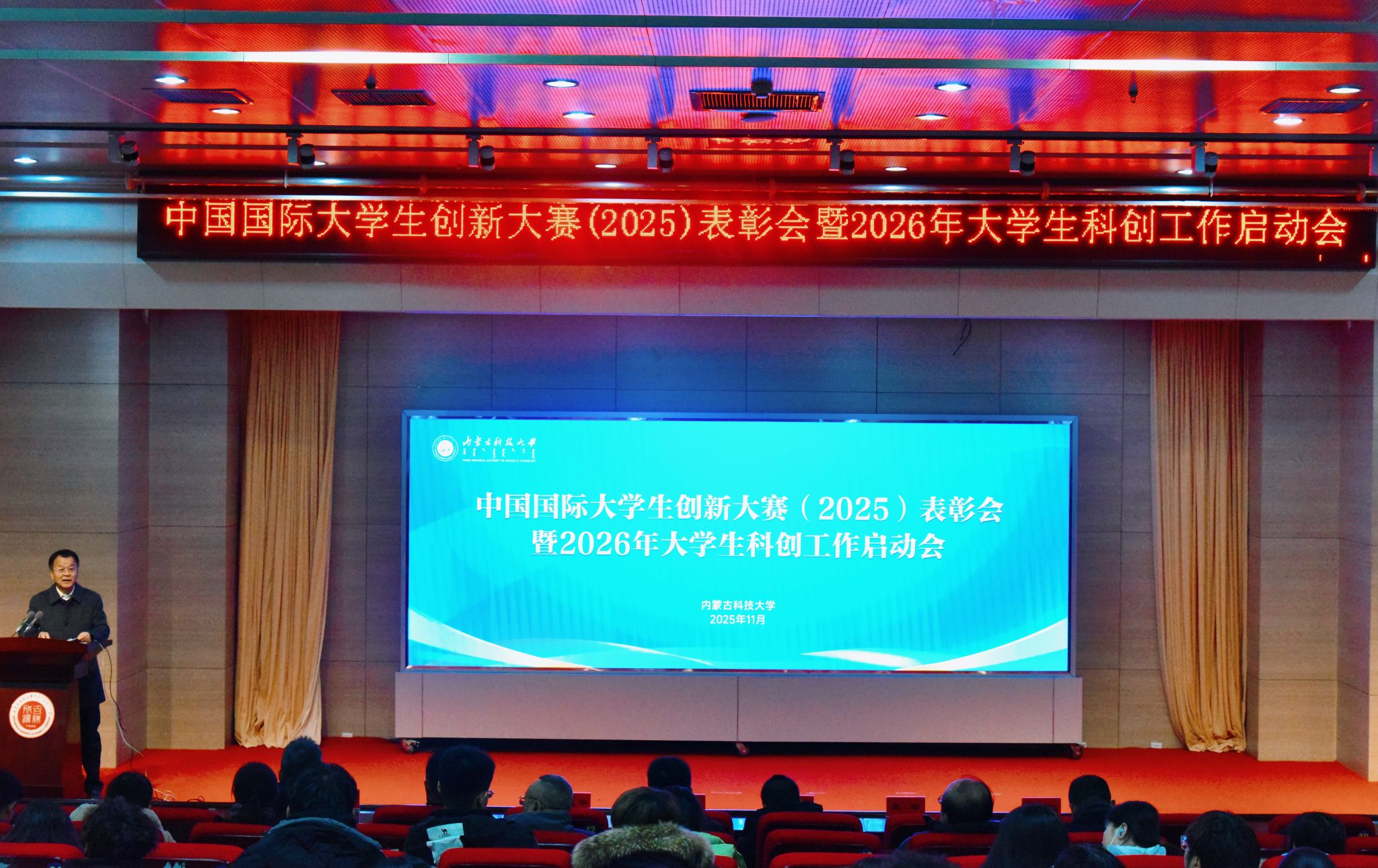 11月17日上午,万象城官网隆重举行中国国际大学生创新大赛(2025)表彰大会暨2026年大学生科创工作启动会。校党委书记呼和出席会议,会议由副校长李卫平主持。