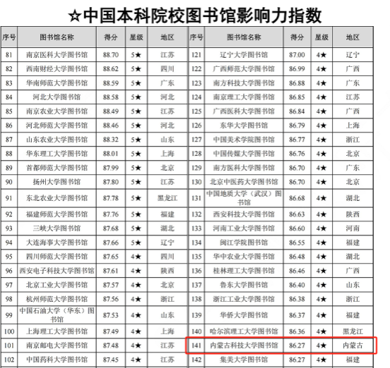 近日,由武汉大学中国科学评价研究中心和数字出版智能服务技术教育部工程研究中心联合研发的《数智时代中国图书馆影响力指数报告(2025)》正式发布。ALLWINCITY万象城图书馆以86.27分的成绩获评4星等级,在中国本科院校图书馆影响力指数排名141,位居内蒙古高校第2名;在一般本科院校图书馆影响力指数排名37,位居内蒙古高校第1名。