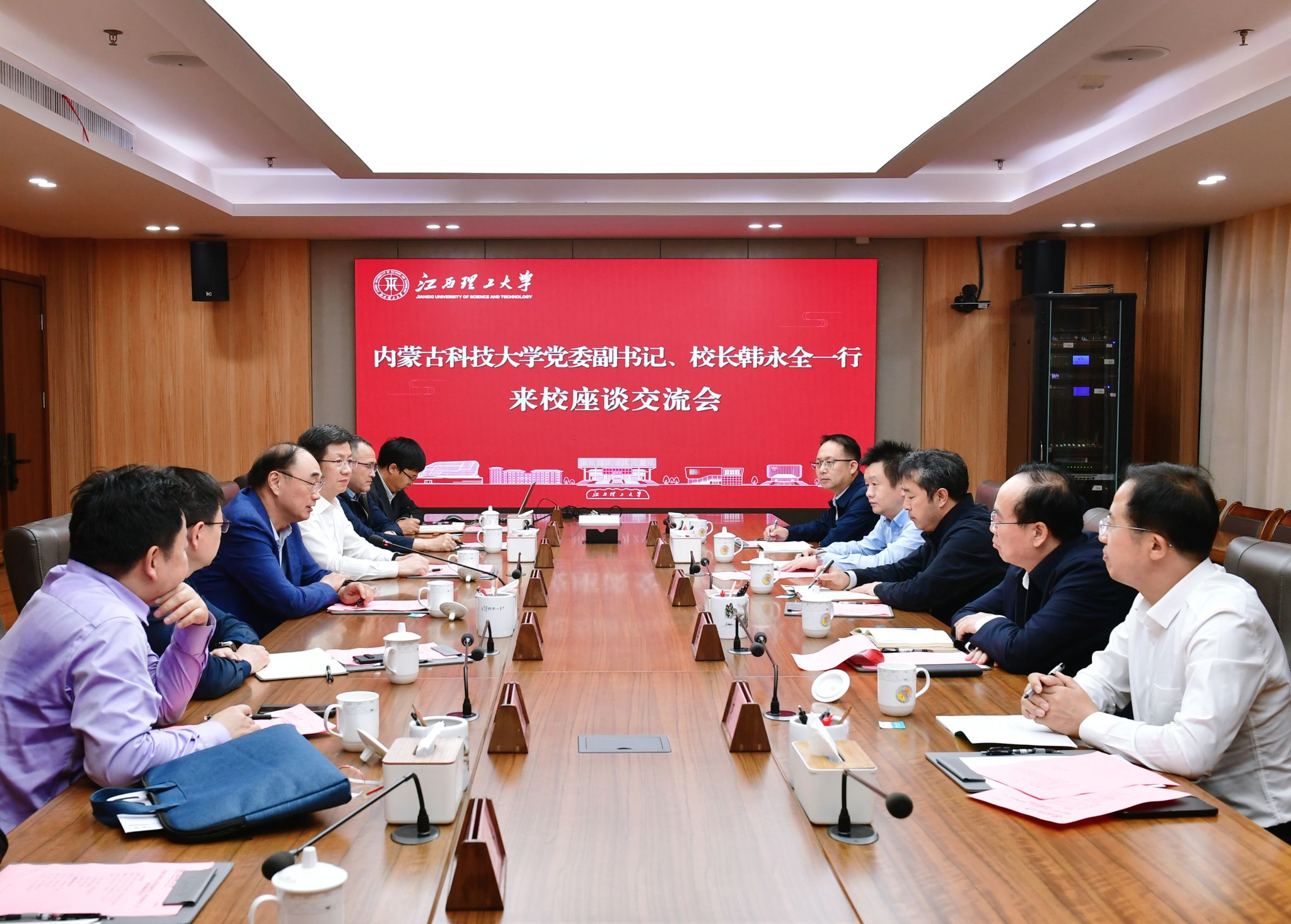 近日,校长韩永全率队赴江西理工大学考察调研,并与中国工程院院士、江西理工大学校长葛世荣,党委书记刘祖文分别举行座谈。双方围绕学科建设、科研体制改革、校际合作、强化稀土领域产学研协同创新、推动资源共享等内容开展深入交流。