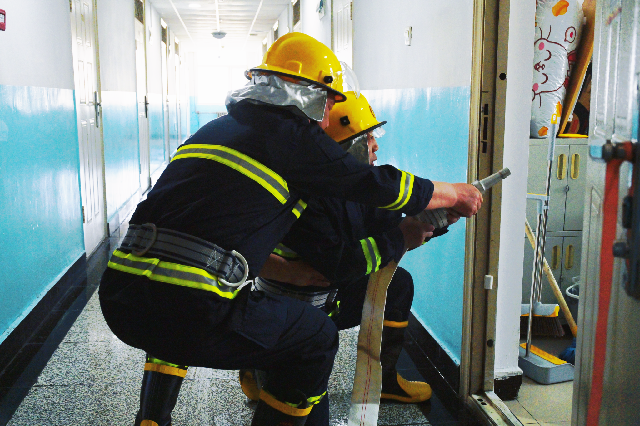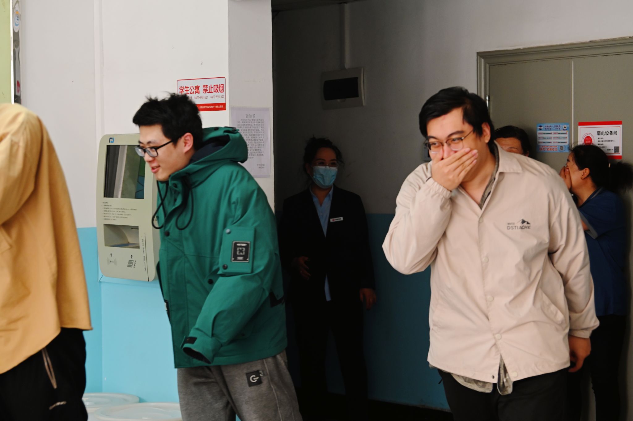 下午3时,火灾警报声响起,公寓楼内弥漫起模拟浓烟,各楼层疏散引导员立即到位,严格按照预定疏散方案,引导学生用湿毛巾捂住口鼻、弯腰低姿,沿安全出口指示标识快速有序撤离。