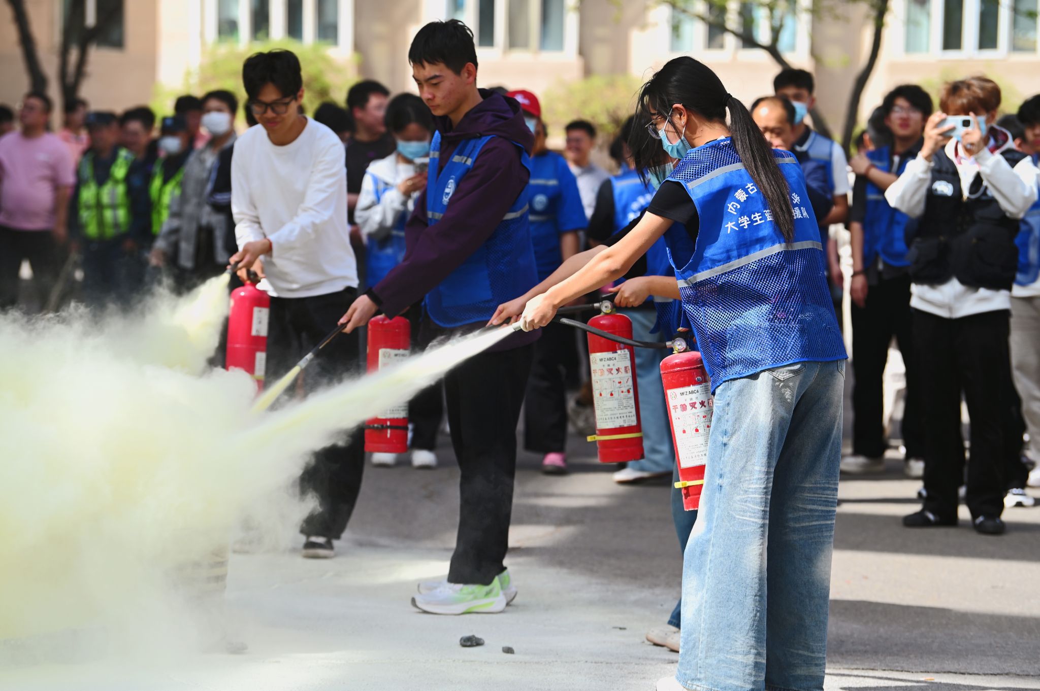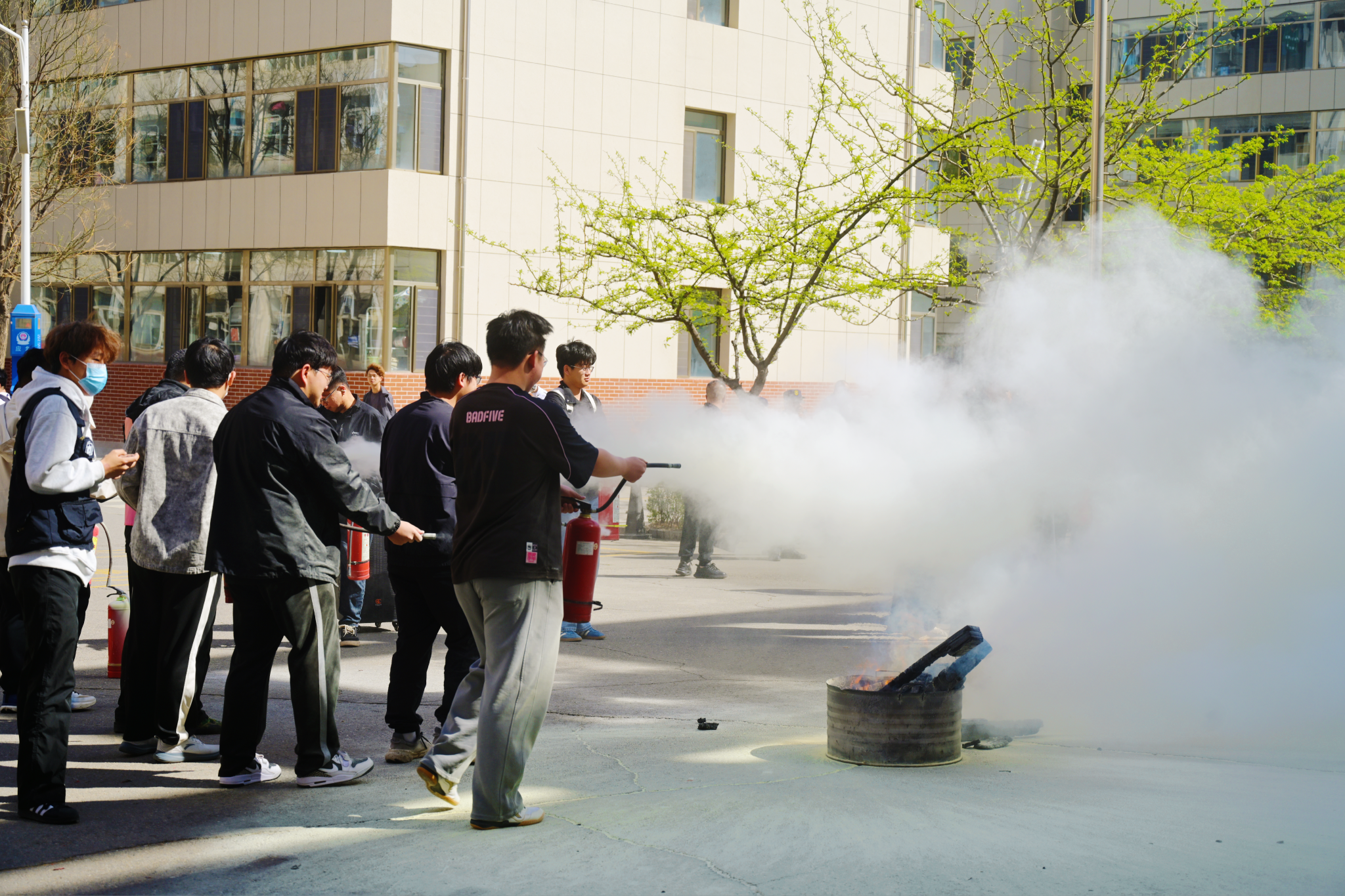 疏散演练结束后,随即开展灭火实操培训。教官结合校园火灾高发特点,采用“理论讲解+现场演示”的方式,向全体参与者详细讲解了校园火灾的常见成因、初期火灾扑救技巧、灭火器的种类及使用原理,重点强调了火灾现场自救互救的注意事项,普及了消防安全相关知识。