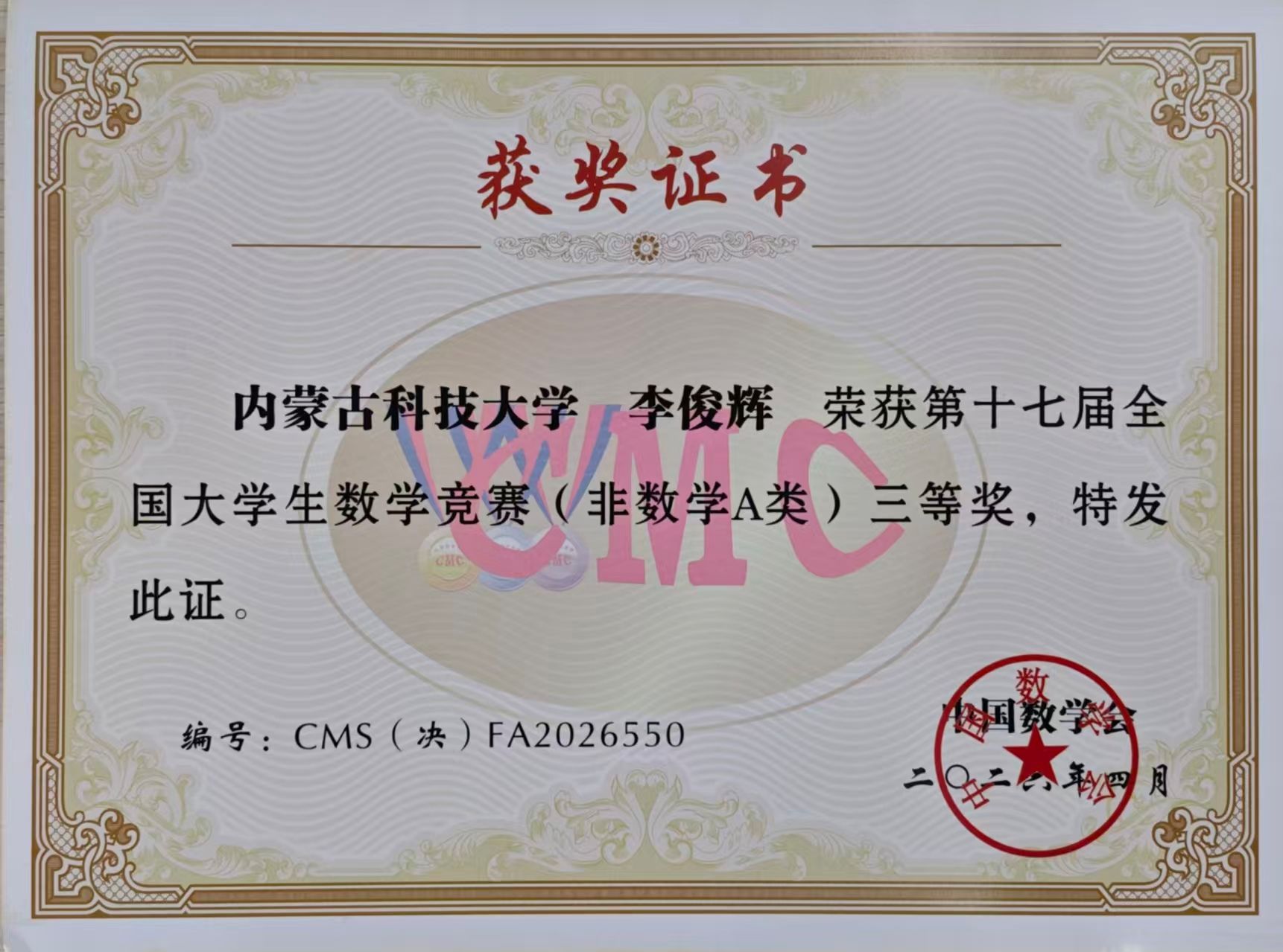 4月17日至19日,第17届全国大学生数学竞赛决赛在四川成都举行。万象城官网材料科学与工程学院学生李俊辉,在理学院葛素琴老师的悉心指导下,凭借扎实的数学功底和稳定的发挥,荣获非数学A组全国三等奖。