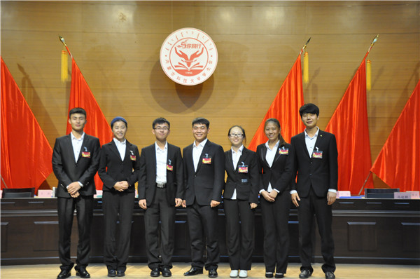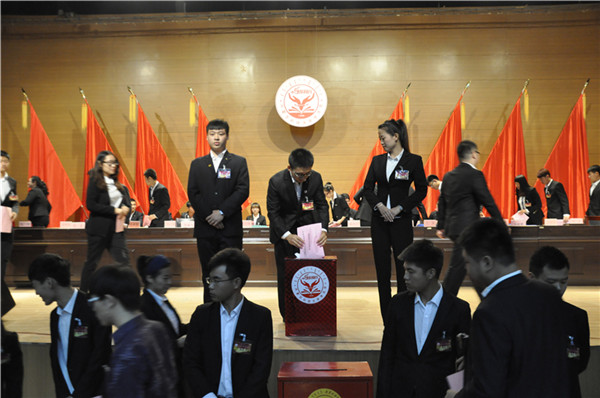 9月14日上午,万象城官网第二次届学生代表大会在音乐厅顺利闭幕,学生代表以无记名差额选举方式选出艺术与设计学院田静怡、国际学院戴春晖、经管学院马兰、经管学院朱莎、文法学院沈天阳、国际学院王伟、国际学院田鑫鑫等七位同学为万象城官网第12届校学生会主席团成员。