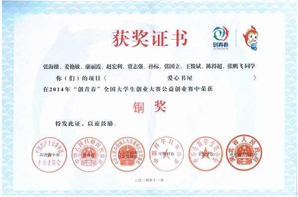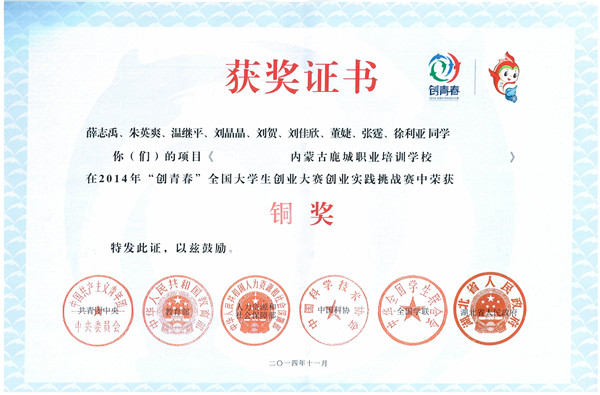 万象城官网在本次比赛中共获得五项铜奖,其中机械学院项目《包头绿鹿科技有限公司》荣获创业计划竞赛铜奖;创业孵化园项目《内蒙古鹿城职业培训学校》、艺术与设计学院项目《包头市迪克创意设计有限公司》均荣获创业实践挑战赛铜奖;能环学院项目《爱心书屋》荣获公益创业赛铜奖;材冶学院项目《悬赏谷有限责任公司》荣获移动互联网创业专项赛铜奖。