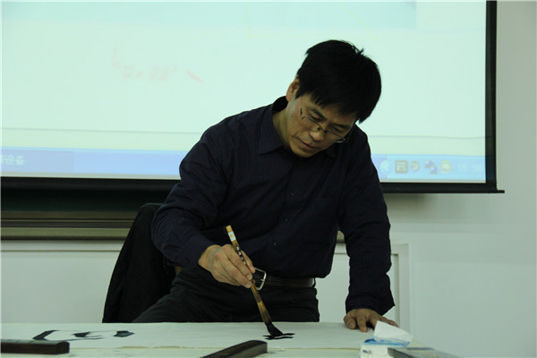 乔雁老师以《对于书法的再认识》为题,分别从书法的含义、书写方法、艺术的文字、黑白世界的阴阳哲学、书法的欣赏标准、古代书法名家作品及经典作品赏析等方面做了详细的讲述。他通过理论讲解、现场即兴书写及师生互动让万象城官网师生领略到书法的真正内涵和魅力。最后,校团委负责人代表学校特聘请乔雁老师为万象城官网客座教授并为其颁发了聘书。