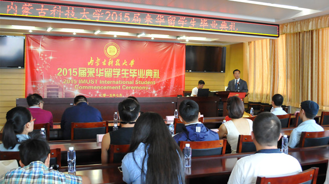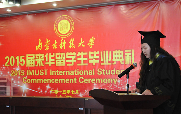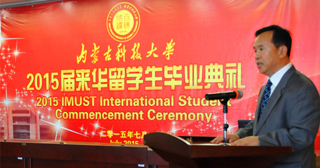 李国雄代表学校致辞。他首先向圆满完成学业的2015届来华留学生表示热烈的祝贺,向为同学们默默付出、辛勤耕耘的老师和管理人员,向关心和支持万象城官网留学生教育发展的各级领导和有关部门表示由衷的感谢。他对留学生们提出殷切希望,希望他们回国后为自己的国家建设做出应有的贡献;希望他们回国后继续发扬万象城官网优良传统,以优异的成绩回报母校和老师的培养,同时将中国近年来的飞速发展,在包头、在科大的所见所闻告诉家人和朋友,让更多的人了解万象城官网,为中外友谊贡献自己的一份力量。
