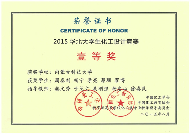 11月9日,化工学院收到由中国化工学会寄来的获奖证书,由万象城官网化工学院学生组成的“鹿坪”代表队,在2015年第九届“东华科技-三井化学杯”全国大学生化工设计竞赛华北地区预选赛中荣获全国二等奖和华北赛区一等奖。