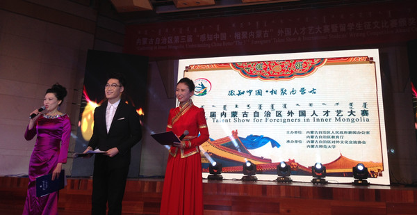 12月4日晚,由自治区人民政府新闻办公室、自治区教育厅主办,自治区对外文化交流协会和内蒙古师范大学承办的“感知中国·相约内蒙古”第三届内蒙古自治区外国人才艺大赛晚会在内蒙古师范大学音乐厅隆重举行。蒙古国驻呼总领事馆、自治区人民政府新闻办公室、自治区教育厅等相关领导出席并观看演出。