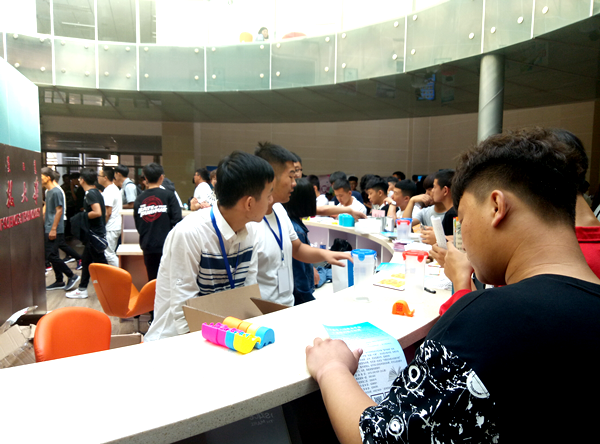 在服务大厅咨询台处,老师在读书协会志愿者的配合下,为同学们讲解如何在网上获得图书馆资源、图书馆微信公众号的诸多功能及2017级新生入馆教育平台的使用指南。新生入馆教育平台是图书馆继讲座参观、视频短片等新生入馆教育方法后的又一创新举措,学生通过网上学习和完成闯关答题游戏,可以自助开通借阅权限,答题成绩优秀者,还可获得不同等级的校园网免费流量奖励,这一新颖的入馆教育形式很快就受到了学生们的关注。
