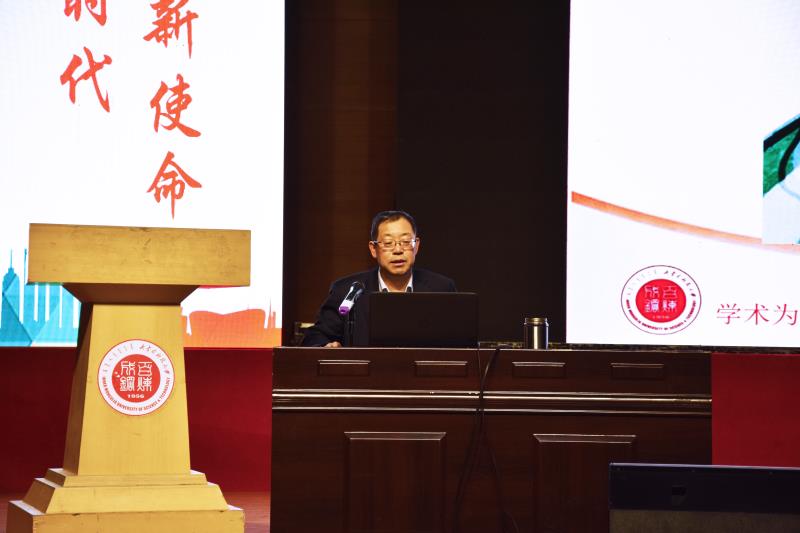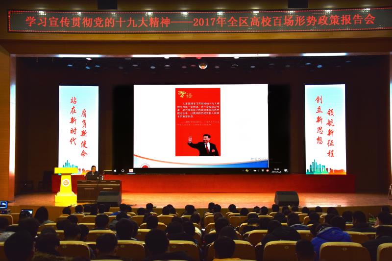 为进一步学习宣传贯彻党的十九大精神,引导广大青年学生自觉用习近平新时代中国特色社会主义思想武装头脑、指导行动,12月8日下午,“学习宣传贯彻党的十九大精神 2017全区高校百场形势政策报告会”在万象城官网举办。万象城官网文法学院院长、教授委员会主任朱海珅教授作了以《站在新时代、肩负新使命、创立新思想、领航新征程——十九大报告关键词“新”之解读》为主题的报告,为万象城官网在场的500余名师生深层次、多角度、全方位解读了党的十九大报告。报告会由校团委书记韩冰主持。