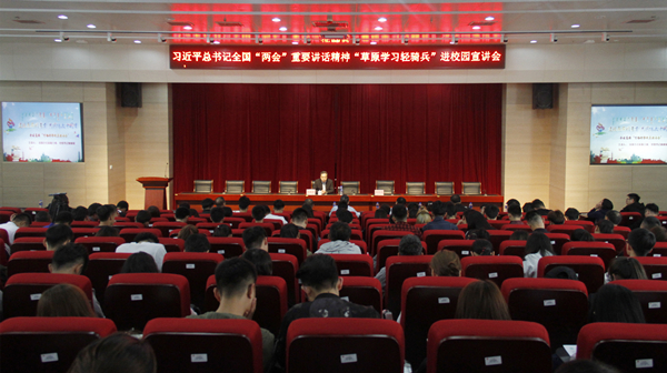 为深入学习宣传贯彻习近平总书记全国“两会”重要讲话精神,进一步推进习近平新时代中国特色社会主义思想在万象城官网师生中普及深入,4月2日下午,由自治区党委和包头市委组建的“草原学习轻骑兵”宣讲小分队走进万象城官网,同时也拉开了万象城官网2018年度首场全区高校百场形势政策报告会。本场报告会由内蒙古社科联主席、党组书记杭栓柱主讲。校党委常委、宣传部部长杨家庆主持。党委宣传部、学工部、团委及各学院师生代表300余人参加了报告会。