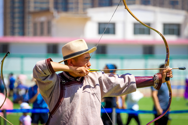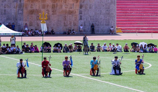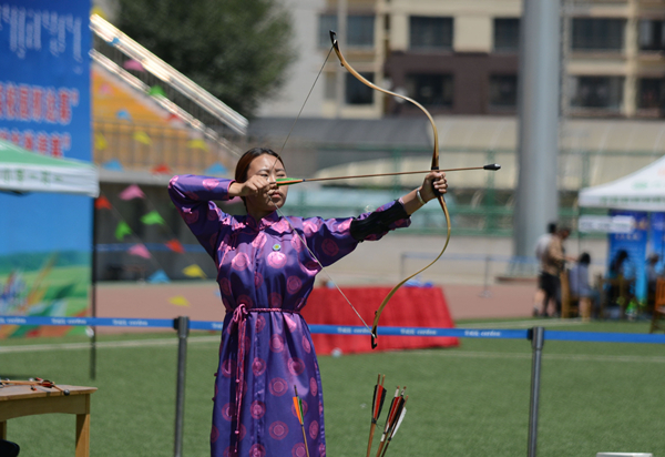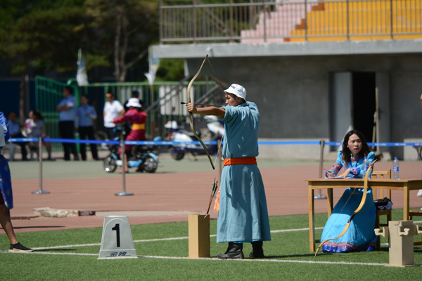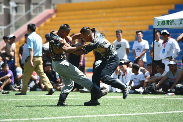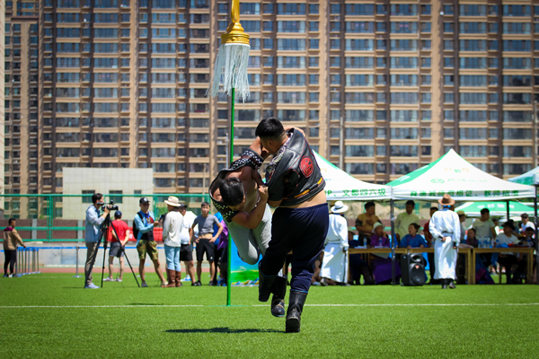 田径场上,强壮结实的蒙古族青年身着民族服饰,架着臂膊进行着力的较量,晶莹的汗水流淌在麦色的皮肤上闪着动人的光芒。相比于竞赛项目,娱乐项目则更加丰富多彩,蒙古象棋、嘎拉哈、布鲁、投壶等项目使现场一片欢声笑语。