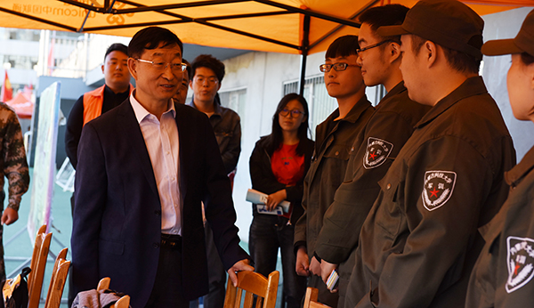走进训练场,安胜利和冯志强亲切询问新生们的军训情况,与辅导员、教官代表一一握手,并在服务站查看了药品箱等应急措施准备状况,对服务人员的辛勤无私的付出表示感谢。部分学院辅导员汇报了学生训练情况、活动开展状况、请假管理及宣传报道的具体情况,并对学校领导的关心表示感谢。