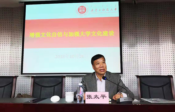 张太平围绕习近平总书记关于坚定文化自信的重要思想,从“什么是文化”、“文化的重要性”、“文化的作用”等方面深入阐述了“文化自信是更基础、更广泛、更深厚的自信”,并结合大学文化的内涵与特征,重点阐述了怎样引导大学文化建设,打造大学文化品牌,进一步推进文化自信。