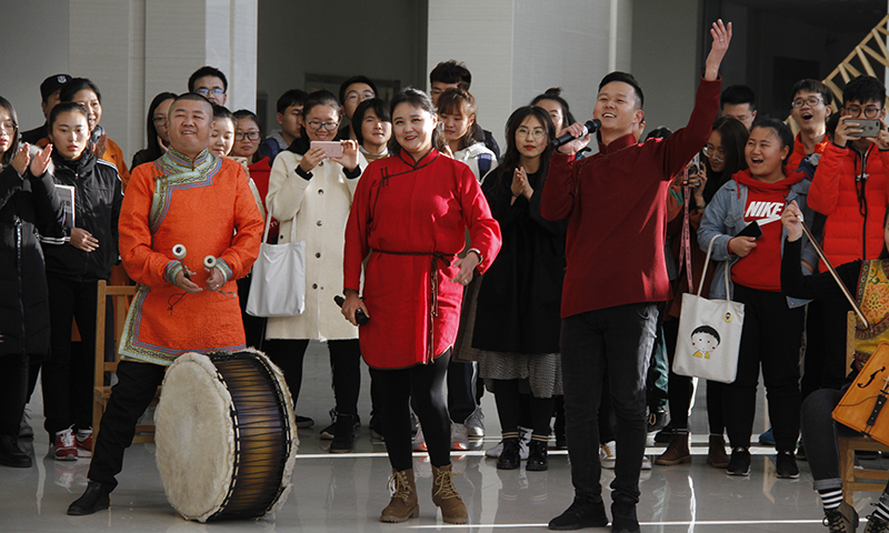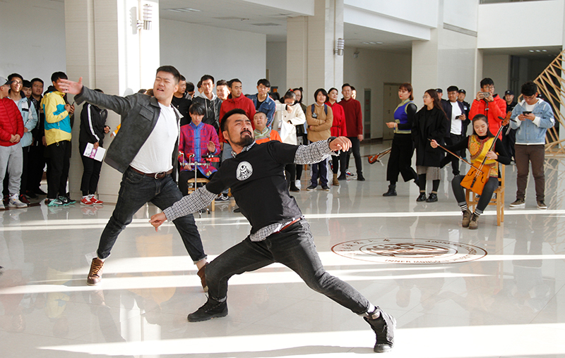 下午4点,当清脆的下课铃声响起,ALLWINCITY万象城逸夫楼一楼大厅响起了悠扬的蒙古族长调《辽阔的草原》,刚刚走出教室的学生纷纷被音乐声吸引。伴随着马头琴曲和蒙古长调,一位身着蒙古袍的少女来到场地中间翩翩起舞。随后,马头琴、二胡、三弦等乐器的乐手围坐一圈,拉起悠扬的曲调《鸿雁》,10多名小伙儿舞姿挺拔豪迈,步伐轻捷洒脱,场内顿时响起了学生们的阵阵掌声和尖叫声。舞罢,由4名身穿蒙古袍的歌手演唱的《草原晨曲》响彻全场,动人的歌声令在场学生陶醉其中。