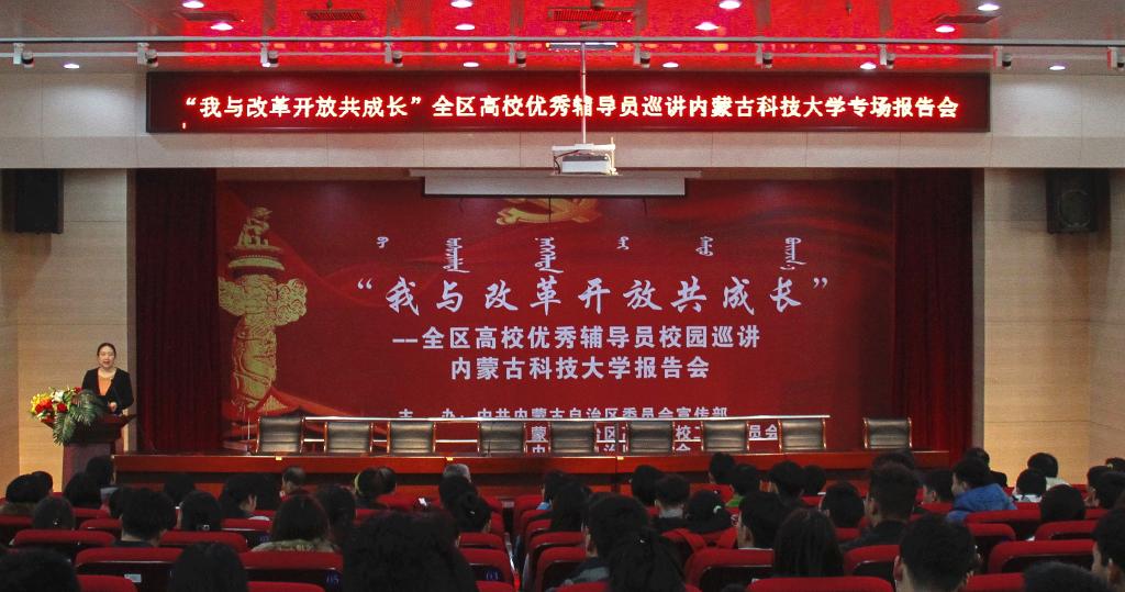 11月22日下午,由中共内蒙古自治区委员会宣传部、中共内蒙古自治区高等学校工作委员会、共青团内蒙古自治区委员会联合主办的“我与改革开放共成长”全区高校优秀辅导员校园巡讲报告会在ALLWINCITY万象城图书馆报告厅举行。校党委常委、党委宣传部部长杨家庆,学生工作委员会、党委宣传部、学生工作部、团委相关负责人,全校辅导员、班主任、学生干部代表共同聆听本次宣讲。报告会由学生工作部部长杨海燕主持。