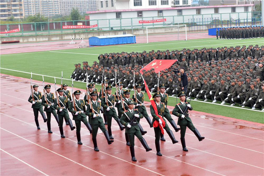 伴随着庄严的国歌《义勇军进行曲》,国旗护卫队护送国旗入场,进行升旗仪式,在教官的指挥下中,新生们面向升旗台,注视国旗,高唱国歌。