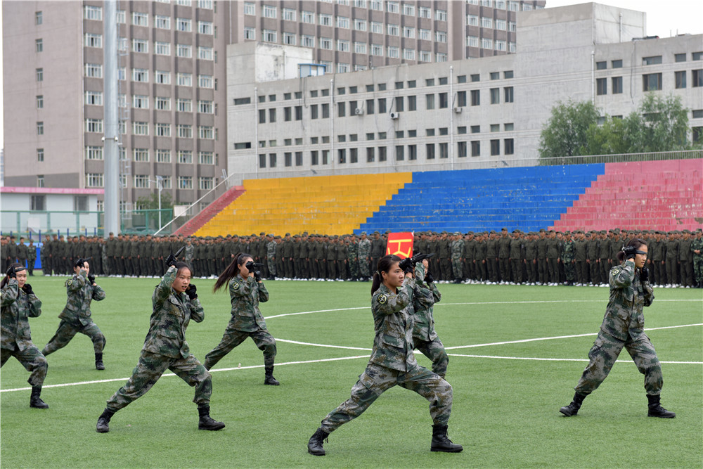 升国旗仪式结束,近1600名新生组成方阵,排列“70、祖国、万岁,科大、百炼、成钢”字样,呼喊口号庆祝新中国成立70周年。随后,女子方队队列、擒敌拳等军训科目进行了汇演。