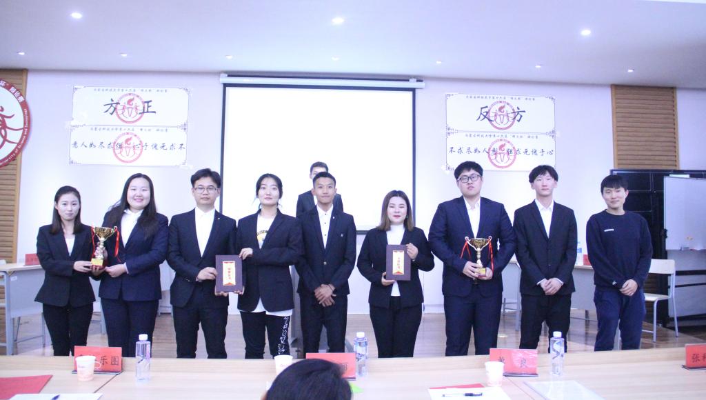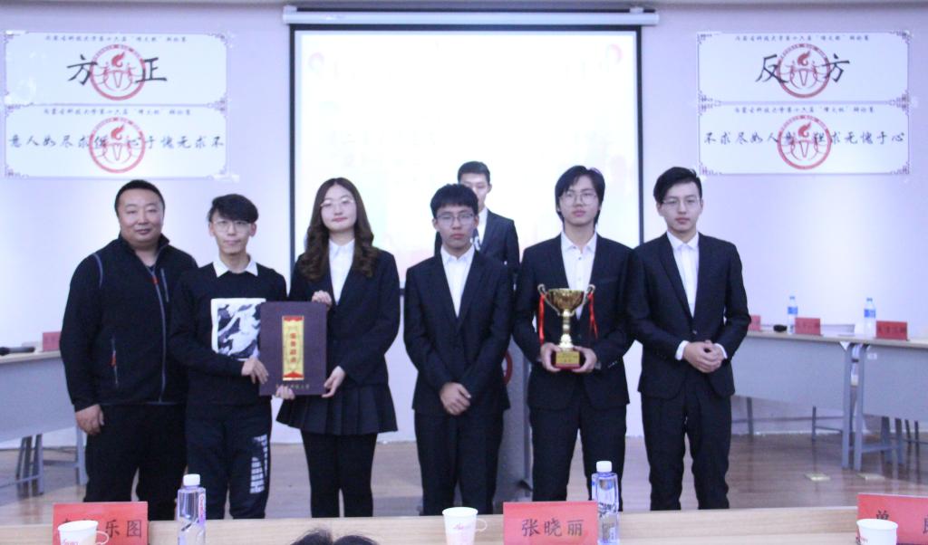 决赛中,正方文法学院辩题为“不求无愧于心,但求尽如人意”,反方土木工程学院辩题为“不求尽如人意,但求无愧于心”。经过激烈的辩论,文法学院获冠军,土木工程学院获亚军,矿业与煤炭学院、研究生院获季军。化学与化工学院、艺术与设计学院、文法学院、研究生院、马克思主义学院、经济与管理学院、矿业与煤炭学院荣获“辩题推荐奖”;张宏静等12名辩手荣获“优秀辩手”荣誉称号;沈建新等8名同学荣获“优秀领队”荣誉称号。