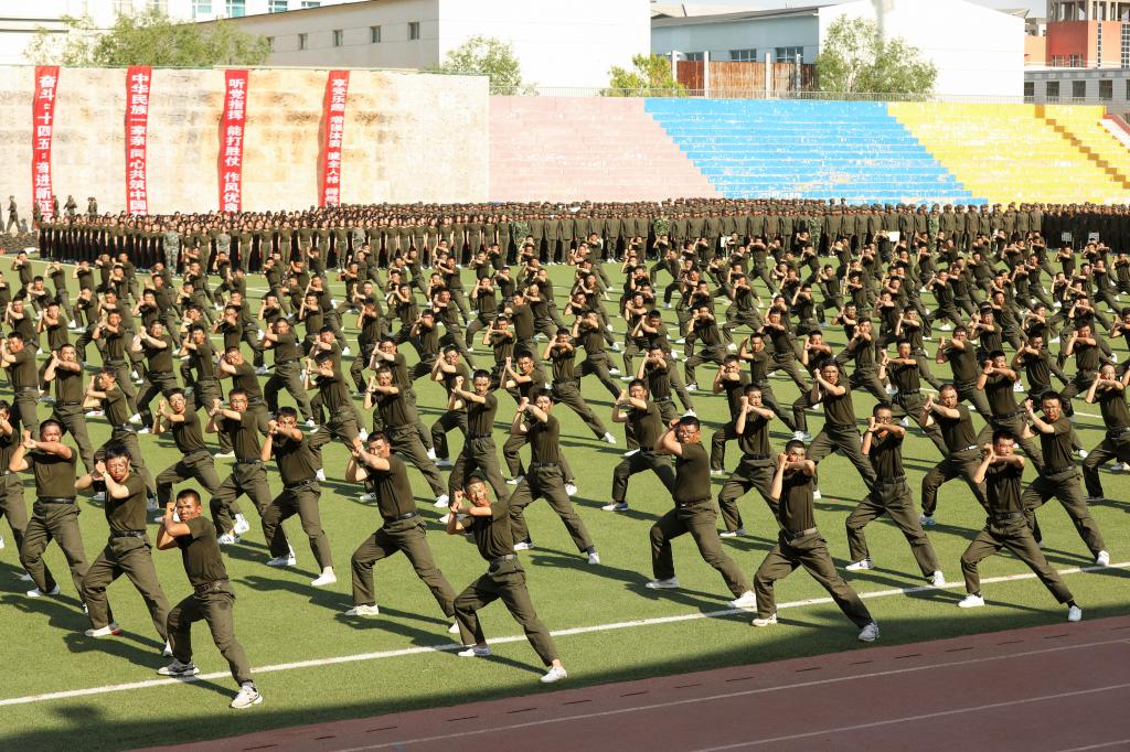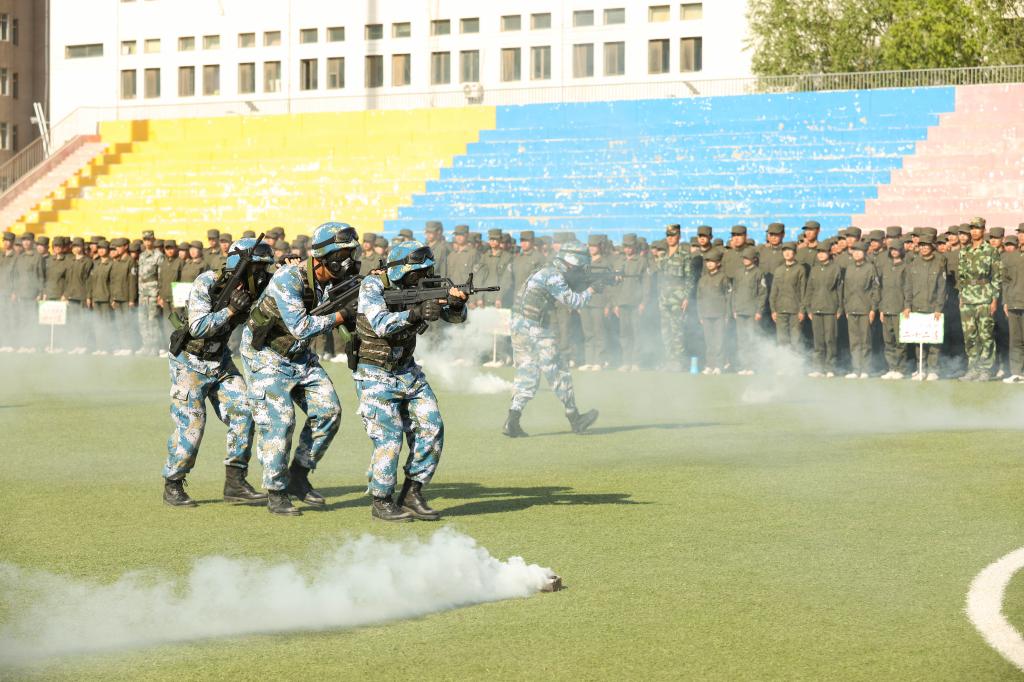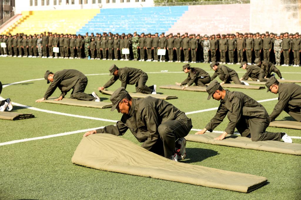 军训成果展示在庄严的国歌声中拉开帷幕。拳术方阵的军体拳整齐划一,兼具力量与速度的对抗;女子匕首操方阵,身姿矫健,乘风破浪;战时救护分队配合默契、训练有素;内务整理分队有条不紊,将一个个柔软的被子叠成“豆腐块”。