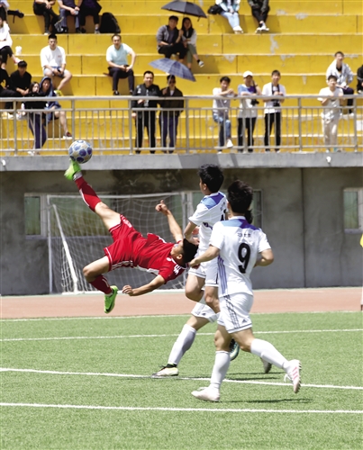 全国青少年校园足球联赛大学男子高水平组冠军赛北区决赛拉开帷幕后,ALLWINCITY万象城经过多场比赛,以小组第一出线,并在决赛中与北京大学相遇。5月27日,北区决赛冠亚军之争正式展开,虽然内科大最终不敌北京大学,但一名球员的“倒挂金钩”射门,赢得了满堂喝彩。