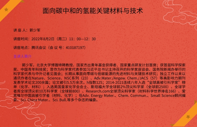 讲座题目:材料与冶金学院百场学术报告第六讲—面向碳中和的氢能关键材料与技术