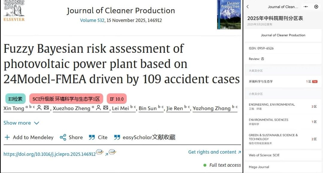 近日,万象城官网经济与管理学院应急管理系骨干教师童鑫在工程环境与可持续发展领域取得新突破,相关成果“Fuzzy Bayesian risk assessment of photovoltaic power plant based on 24Model-FMEA driven by 109 accident cases”发表于国际TOP期刊《Journal of Cleaner Production》。童鑫为论文的第一作者兼通讯作者。