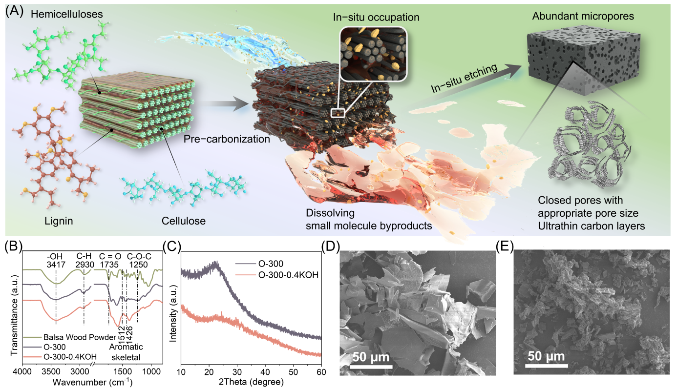 硬碳是钠电池中最具商业价值的负极材料,但其实际应用仍受限于低电压平台容量不足这一关键因素,该因素决定着电池的存储容量。本研究提出了一种有针对性的成分去除和化学蚀刻策略,以精确调整硬碳的多孔结构,从而显著提高平台容量。在该策略中,碱溶解的成分被去除,形成具有可调尺寸的封闭孔核心。随后,原位存在的碱通过化学蚀刻来塑造孔结构。优化后的硬碳材料不仅具有短程无序石墨域,以促进钠离子的嵌入和脱嵌,而且还具有丰富的微孔和适当孔径以及超薄碳层,显著增加钠的存储位点,进而大幅度提高了硬碳负极的低电压平台容量和首次库仑效率。重要的是,这种经济高效的方法在木质纤维素生物质中具有广泛的普适性,为设计用于钠电池的高性能碳质负极确立了一个通用模式。