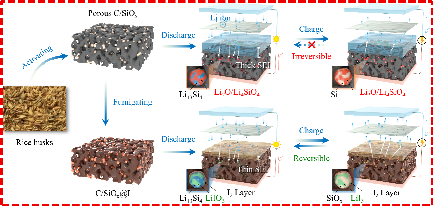 具有更高容量和更低锂化电位的C/SiOx负极已被认为是下一代可替代石墨用作高能量密度锂电池的负极材料。然而,C/SiOx存在首次库仑效率低的问题,极大地阻碍了其实际应用。在本研究中,我们报道了一种简单的碘氧化还原反应策略,以实现高容量C/SiOx负极在长寿命锂电池中高度可逆的锂存储行为,并显著提高其首次库仑效率。具体而言,通过简单的熏蒸将I2引入多孔C/SiOx中,合成其复合物(C/SiOx@I),其中I2能够通过氧化还原反应有效地抑制SiOx的不可逆锂化反应。此外,LiI3和LiIO3作为氧化还原反应中间产物能够抑制电解质和LiPF6的分解,从而减少固体电解质膜的厚度,显著提升C/SiOx首次库仑效率和循环稳定性。这项研究为开发高首次库仑效率SiOx基负极材料以用于高能量密度锂电池开辟了一条新途径。
