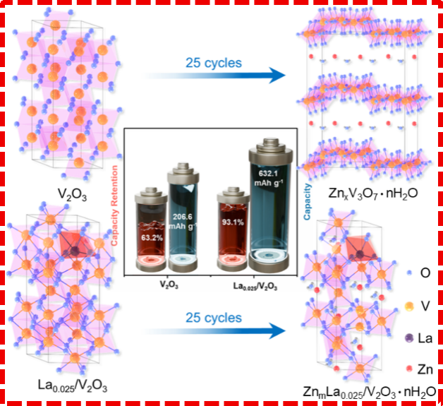V2O3具有八面体隧道状的三维结构,有利于金属离子的快速嵌入与脱嵌,在水性锌离子电池中表现出较高的比容量。然而,其在循环过程中易发生相变,导致结构坍塌和容量衰减。本研究提出一种新型La3+掺杂策略,可有效抑制V2O3的不利相变,从而构建高性能、结构稳定的锌离子电池正极材料。引入的La3+离子不仅能够扩大晶格体积、拓宽离子传输通道,还可提供额外的Zn2+存储活性位点,并促进Zn2+扩散与电子传导。重要的是,La3+掺杂有助于维持V2O3的八面体隧道骨架结构,在反复充放电过程中抑制相变的发生,显著提升正极材料的循环稳定性。