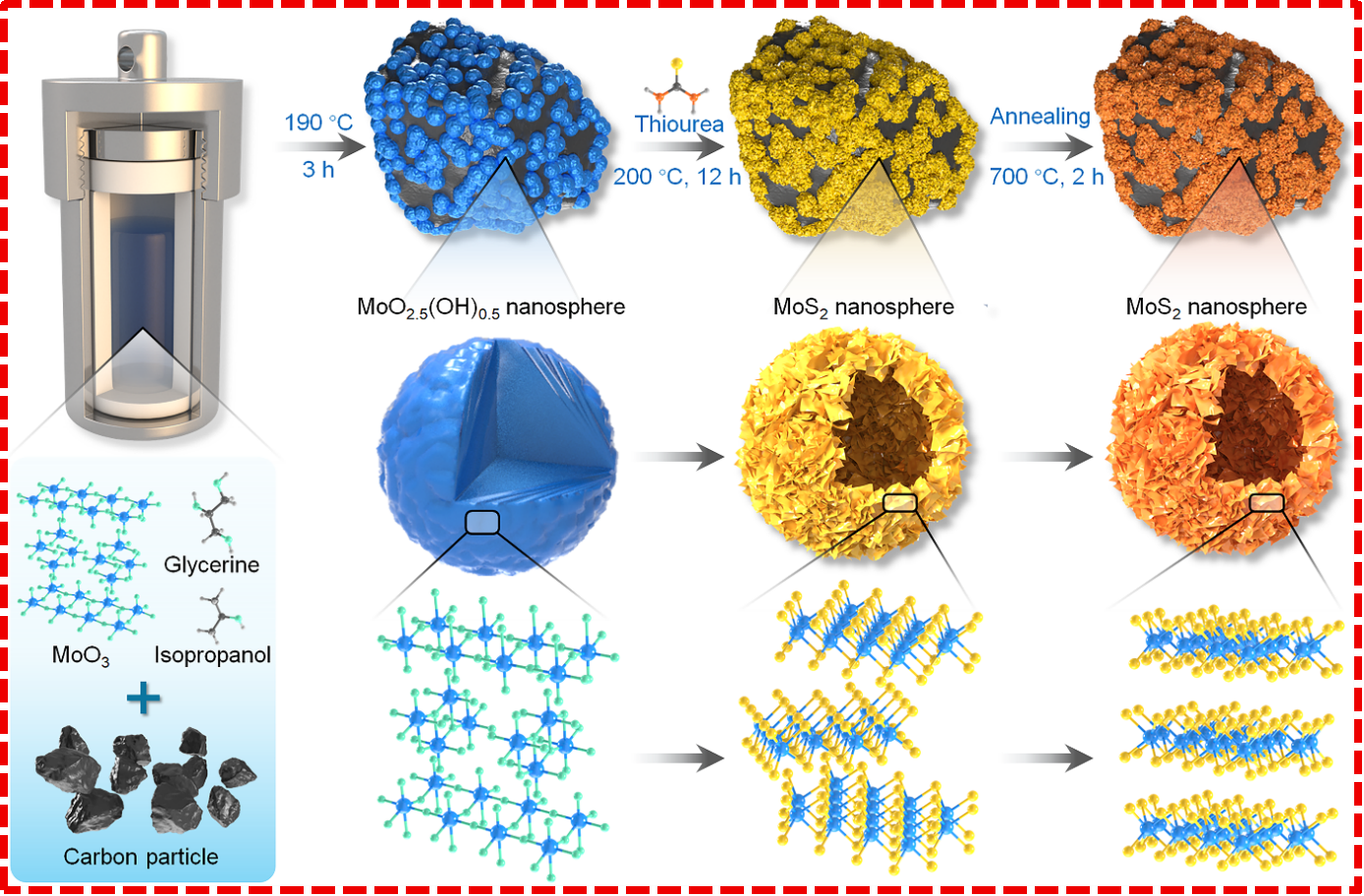 二维层状材料二硫化钼(MoS2)具有独特的“钼-硫-钼”三明治结构,层间距较大,因而被视为一种极具潜力的钠离子存储应用负极材料。然而,由于其固有的导电性较低、体积膨胀显著以及颗粒严重团聚等问题,限制其实际应用。本研究提出了一种新型的两步溶剂热合成方法,可在无需任何模板的条件下,成功制备由超薄纳米片自组装形成的、均匀且紧密负载于褐煤基碳载体上的二硫化钼空心纳米球(MoS2/C)。这些超薄纳米片组装成的空心结构不仅缓解了MoS2在充放电循环过程中的体积变化,还促进了Na+的扩散,降低其在MoS2内部的迁移能垒。褐煤碳提高了MoS2的电导率,防止MoS2颗粒聚集,并在反复充放电过程中减轻了机械应力。所制备的空心球形MoS2/C复合材料用作钠离子电池负极时表现出卓越的循环稳定性和倍率性能。