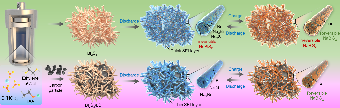 Bi2S3是一种极具潜力的钠离子电池负极材料,因其具备高比容量和优异的成本效益而受到广泛关注。然而,在充放电循环过程中伴随的显著体积膨胀现象,导致材料出现循环稳定性差与首次库仑效率低等问题,严重制约了其在实际应用中的进一步发展。本研究采用溶剂热法将Bi2S3纳米棒负载于褐煤衍生的碳骨架上,成功制备出一种高性能的阳极材料(Bi2S3/LC)。实验研究与理论计算相结合,表明LC的存在可有效提高Bi2S3的孔隙率及硫空位浓度,从而增强其钠化中间产物NaBiS2对Na+的吸附能力与电化学可逆性。此外,在酯基电解质中添加氟乙烯碳酸酯(FEC)可促进负极表面原位生成均匀且超薄的富NaF固体电解质膜,并有效提升其结构稳定性,进而提升Bi2S3负极的首次库伦效率和循环稳定性。