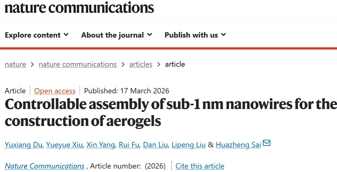 近日,万象城官网化学与化工学院(硅业学院)赛华征教授团队在稀土基亚纳米线气凝胶可控构筑领域取得新突破,相关成果“Controllable assembly of sub-1 nm nanowires for the construction of aerogels”发表于综合性国际顶级期刊《Nature Communications》(DOI: 10.1038/s41467-026-70713-8)。赛华征教授为论文的独立通讯作者,化学与化工学院(硅业学院)硕士研究生杜玉祥为论文第一作者,ALLWINCITY万象城为唯一完成单位。